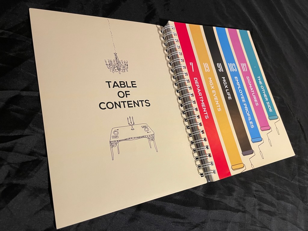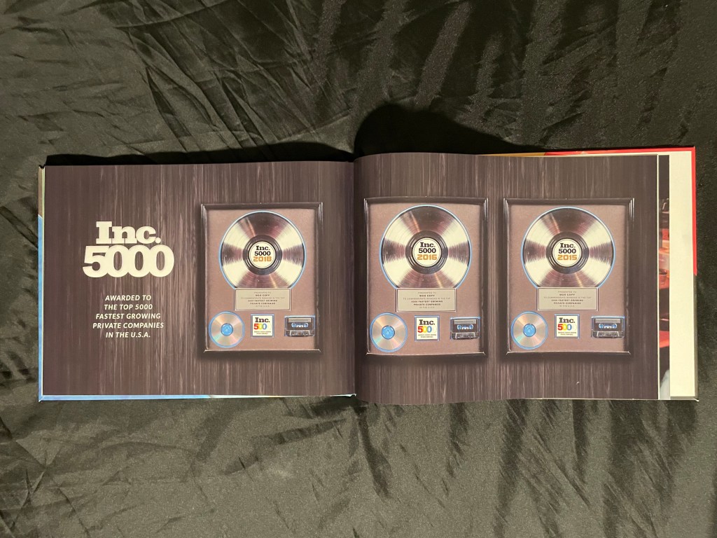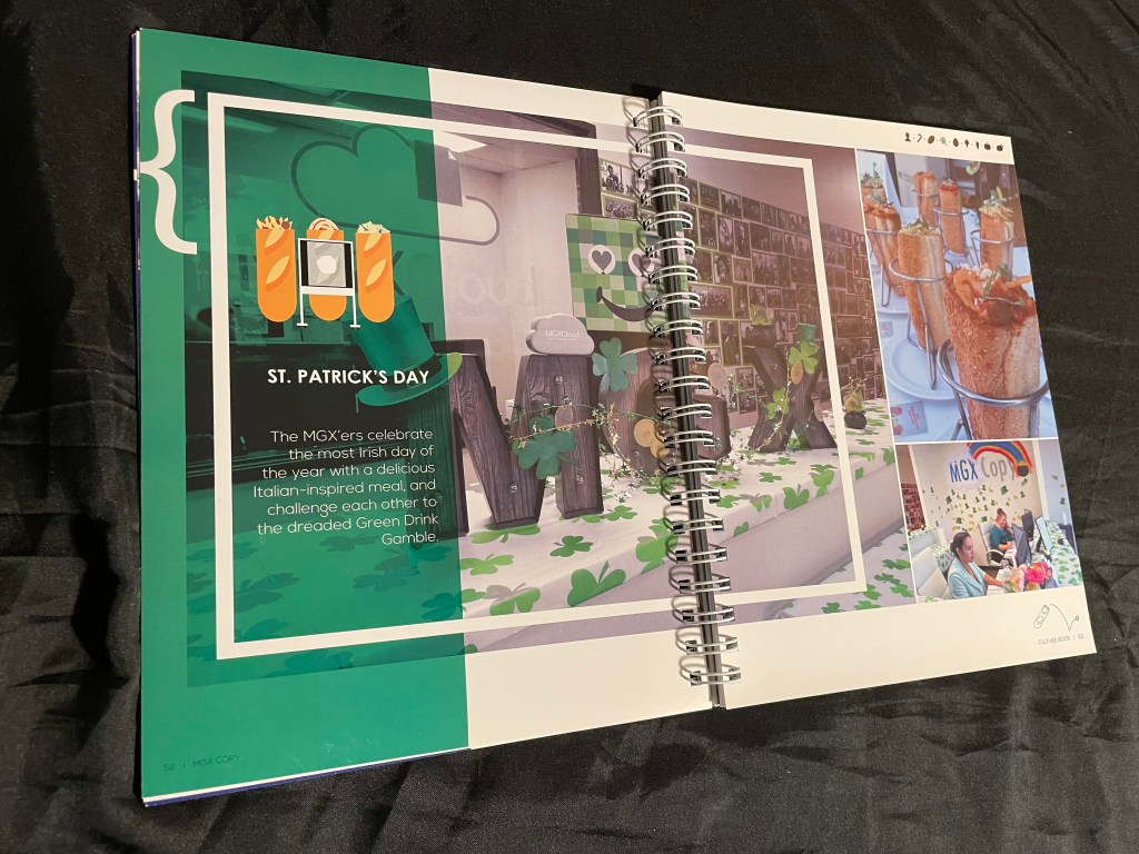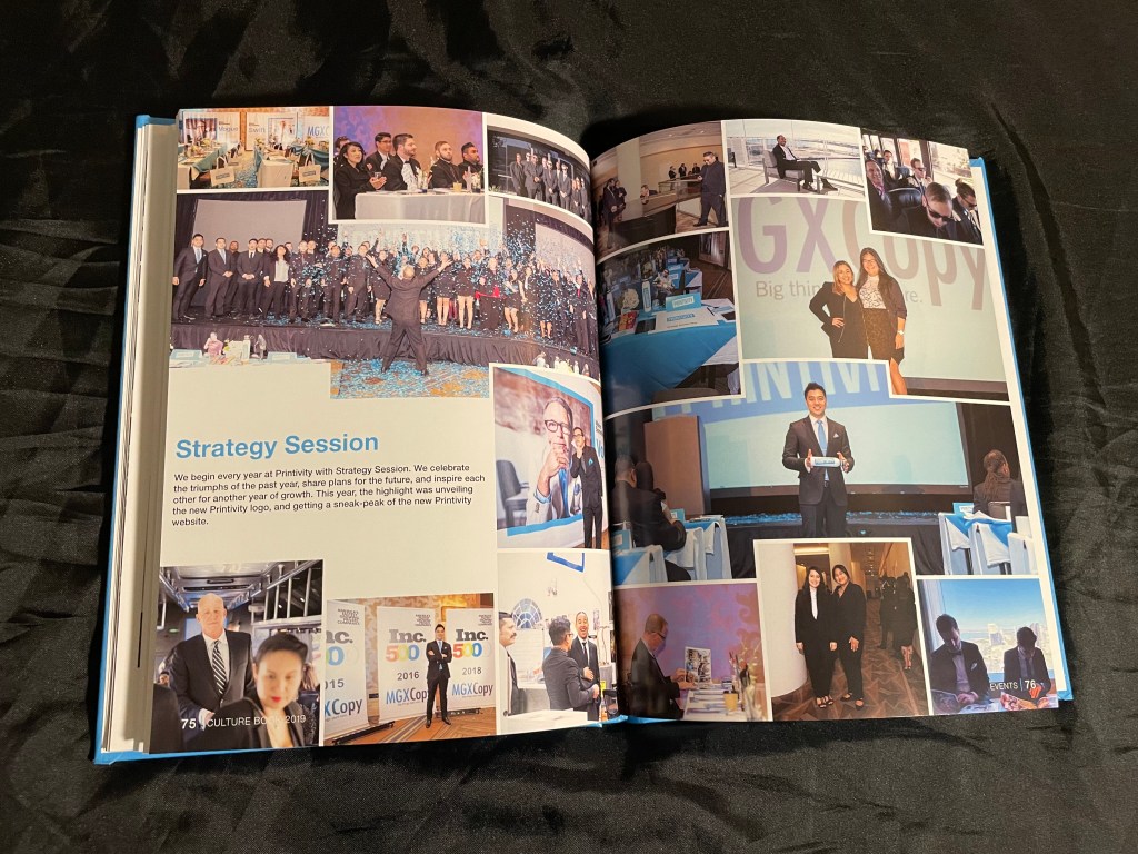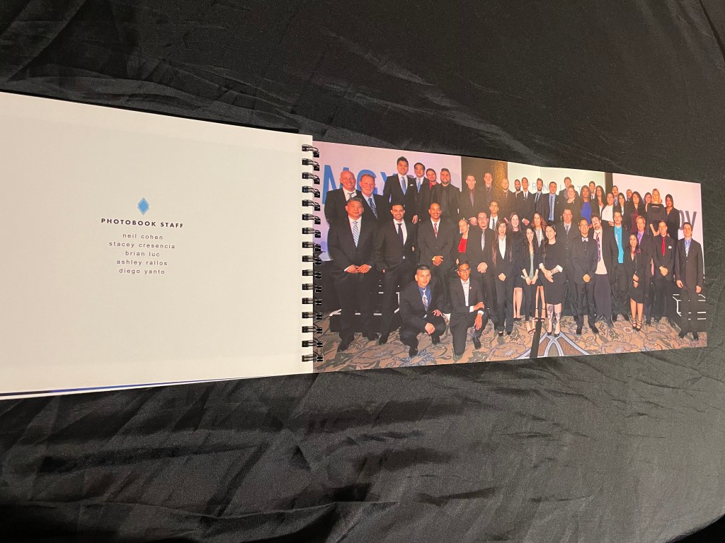 Half of this photo book was for a Disneyland trip and the other was for the company’s annual Strategy Session. The covers and page layout worked so either could be the outside cover thanks to the spiral binding. Including 2 fold out pages with wide group shots of the employees at each event as the “divider” between the sections.
