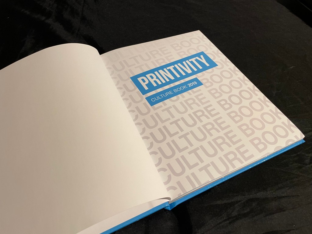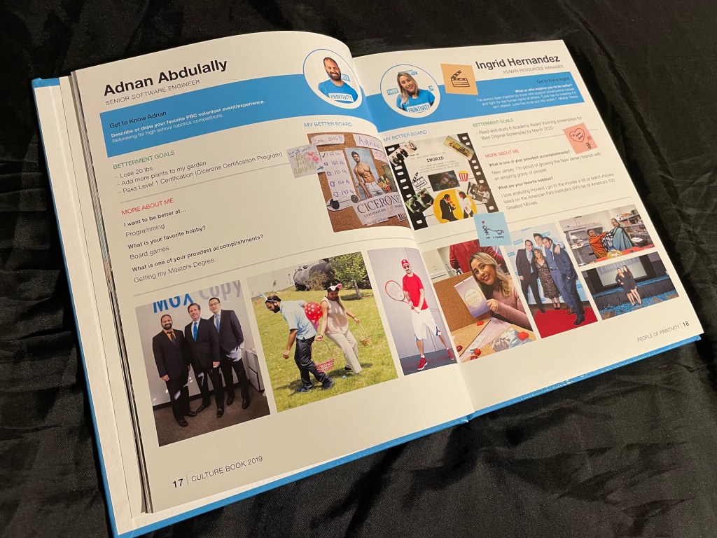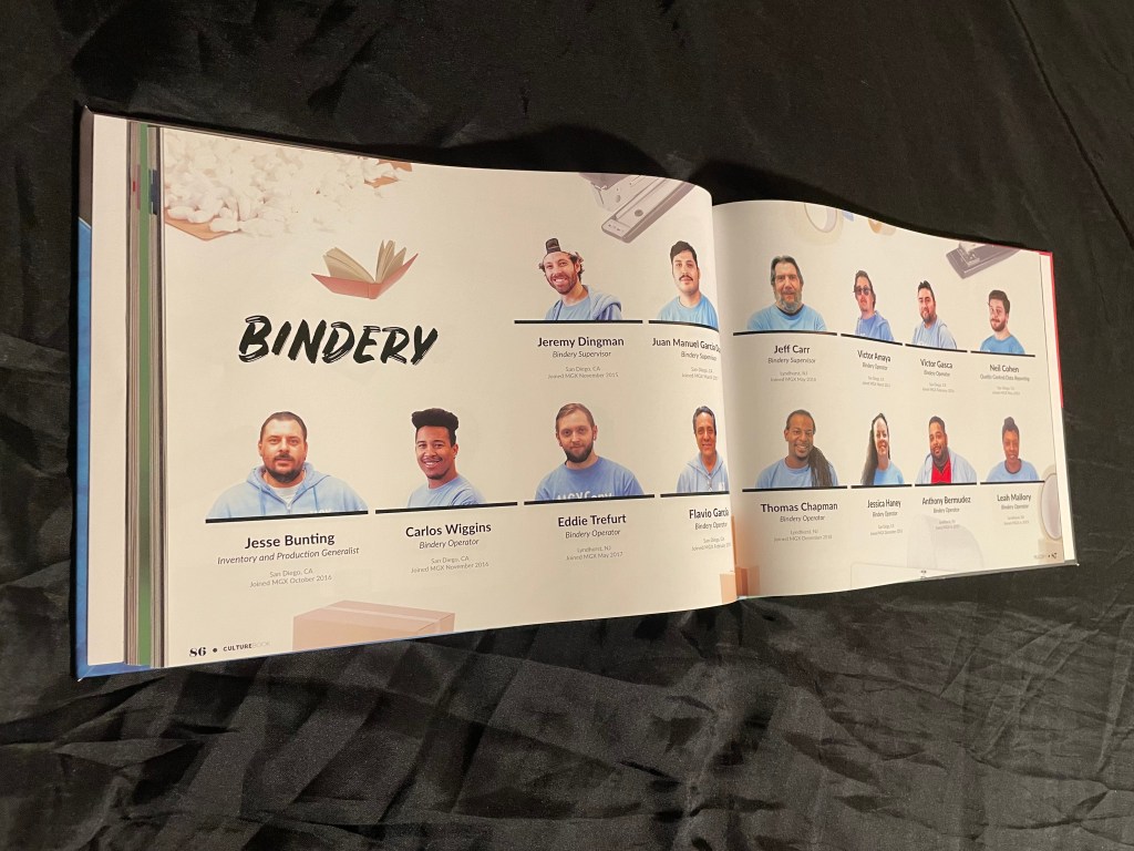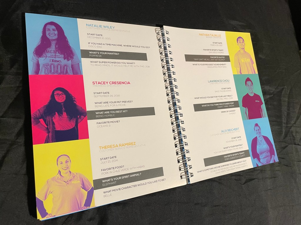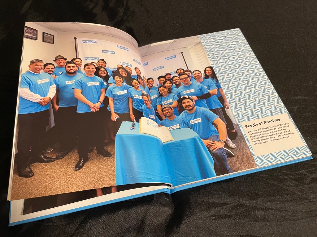 Hard cover book with soft touch laminationHard cover book with spot UV of the employees names repeated for the backgroundThis book had half dedicated to the San Diego branch and the other half to the New Jersey branch. Both outside covers orientated to work as the front cover (half the book was flipped upside down)